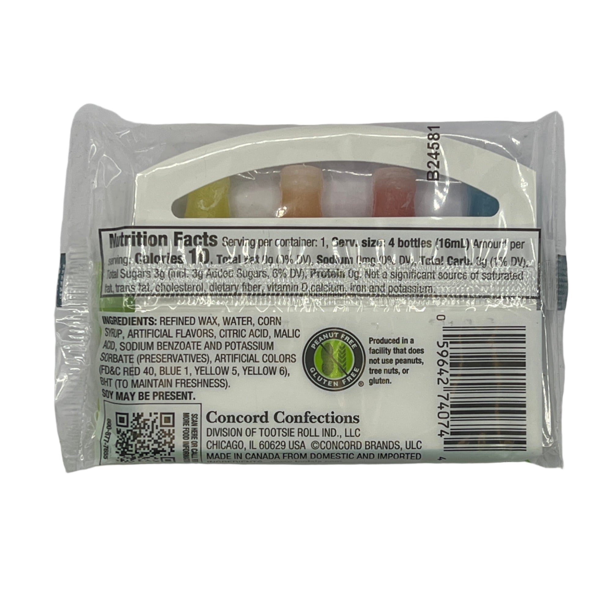 Refined Wax, Water, Corn Syrup, Artificial Flavour, Acids & Acid Regulators (Citric, Malic), Sodium Benzoate and Potassium Sorbate (Preservatives), Artificial Colors (FD&C Red 40, Blue 1, Yellow 5&6, BHT (to maintain freshness).