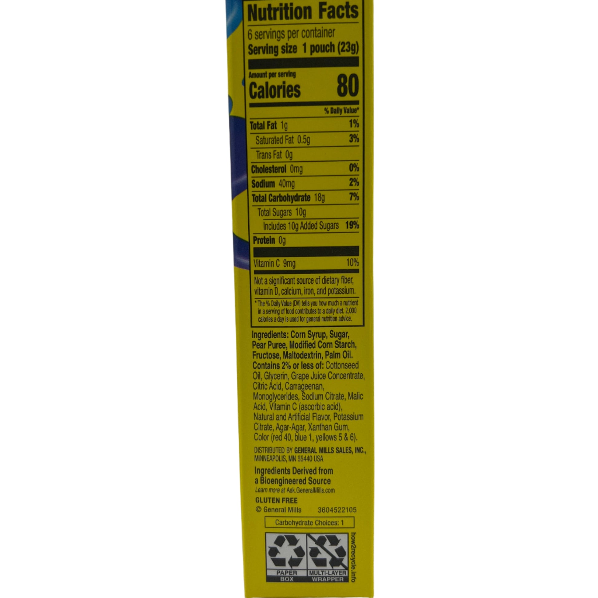 Sugar, Corn Syrup, Dried Corn Syrup, Pear Puree Concentrate, Modified Corn Starch, Fructose, Maltodextrin, Palm Oil. Contains 2% or less of: Cottonseed Oil, Glycerin, Grape Juice Concentrate, Carrageenan, Citric Acid, Monoglycerides, Sodium Citrate, Malic Acid, Vitamin C (Ascorbic Acid), Natural Flavour, Potassium Citrate, Agar-Agar, Xanthan Gum, Colour (Red 40, Blue 1, Yellow 5, Yellow 6).